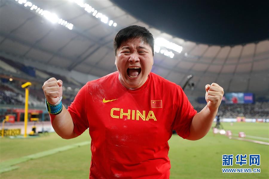 當日,在卡塔爾多哈舉行的2019國際田聯(lián)世界田徑錦標賽女子鉛球決賽中,衛(wèi)冕冠軍、中國選手鞏立姣以19米55的成績奪得冠軍。 新華社記者賈宇辰攝