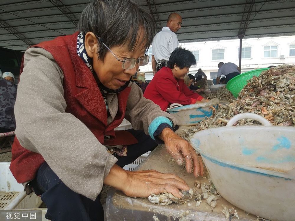 2019年9月13日,農(nóng)歷八月十五中秋節(jié),山東濱州沾化區(qū)魯北海產(chǎn)品批發(fā)市場,村民正在分揀貨物。