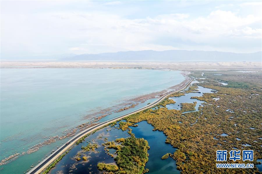 這是新疆博斯騰湖美景(10月12日無人機拍攝)。入秋以來,新疆博斯騰湖碧波蕩漾,美景如畫,吸引各地游客前來游玩。新華社記者丁磊攝