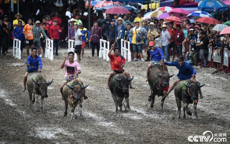央視網(wǎng)消息:當?shù)貢r間2019年10月12日,泰國春武里舉行一年一度的水牛賽跑,選手騎牛狂奔。視覺中國