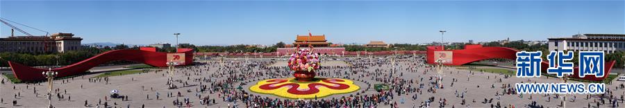 這是10月14日拍攝的天安門廣場中心花壇(全景拼接圖片)。 10月14日,以“花果籃”為主造型的天安門廣場中心花壇吸引了眾多游客參觀拍照。“花果籃”的夜景更是流光溢彩,絢爛迷人。 新華社記者 殷剛 攝