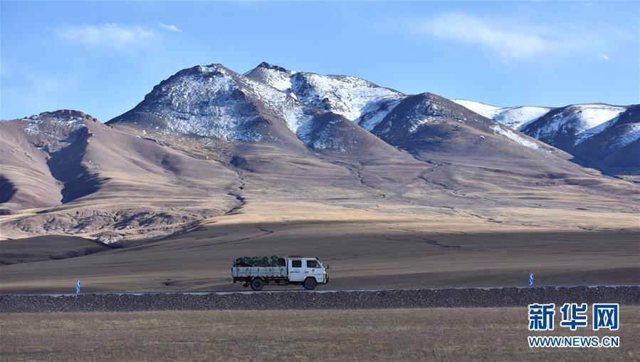 西藏那曲市申扎縣境內(nèi),一輛卡車從山前駛過(10月12日攝)。 深秋時(shí)節(jié)的藏北,最低氣溫已降至零攝氏度以下,呈現(xiàn)出蒼涼和壯美交織的獨(dú)特景觀。 新華社記者 周錦帥 攝