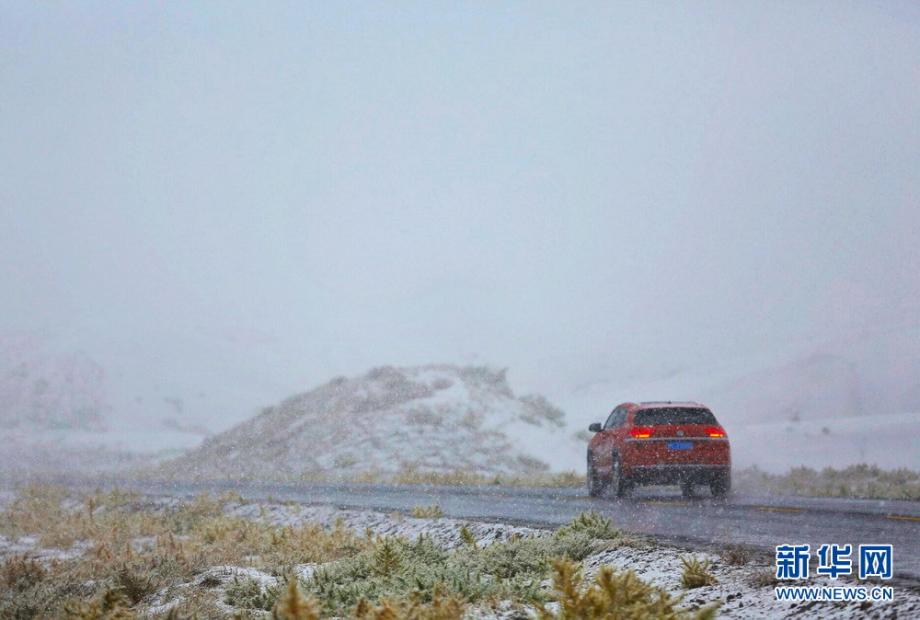 10月15日,在寧夏中衛(wèi)市沙坡頭景區(qū),汽車在大雪中行進。新華網杜文杰攝