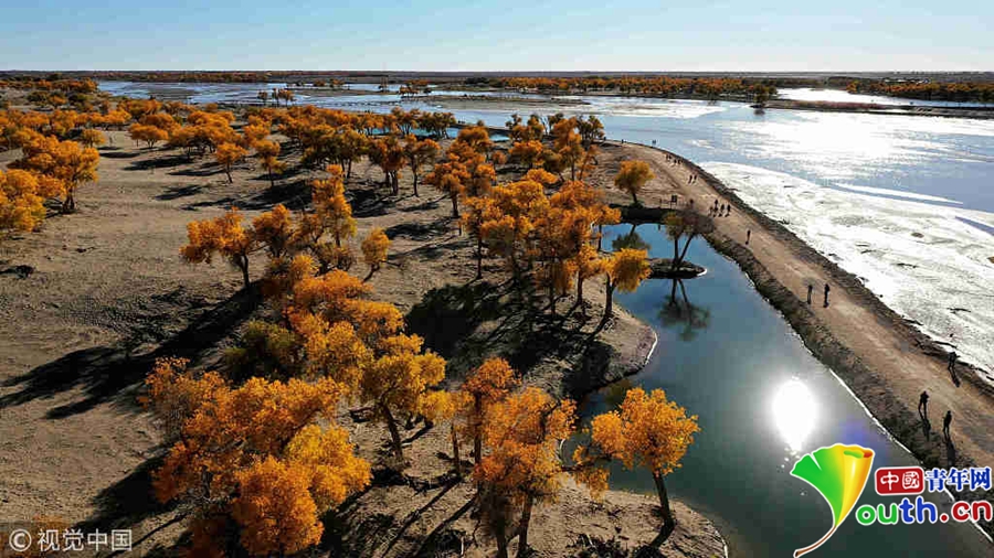 大片的胡楊樹葉由綠變黃,一眼望去,陽光下金色的樹葉襯著湛藍(lán)的天空于風(fēng)中婆娑起舞。