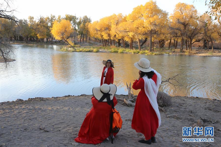 10月10日,在內(nèi)蒙古自治區(qū)額濟(jì)納旗,游客在胡楊林前留影。金秋時節(jié),內(nèi)蒙古自治區(qū)額濟(jì)納旗胡楊林如同披上金裝,成為大漠中的一抹亮色,吸引眾多中外游客前來觀賞游玩。新華社記者安希雅攝