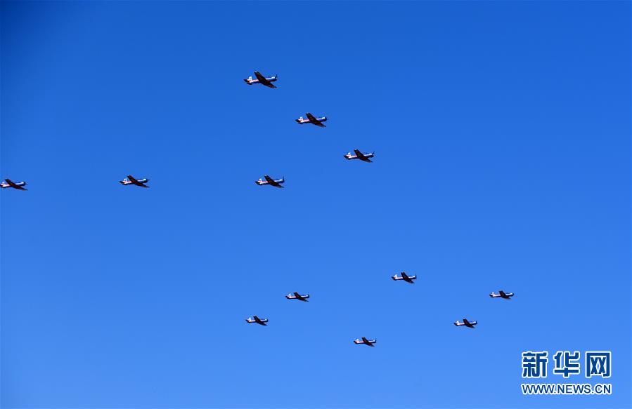 10月17日,“天之翼”飛行表演隊進行飛行表演。 當日,慶祝人民空軍成立70周年航空開放活動在吉林長春開幕??哲姸嘀эw行表演隊、跳傘表演隊共舞藍天,殲-20、運-20、殲-16等多款主力戰(zhàn)機展翅蒼穹,空降兵和航空兵作戰(zhàn)部隊派出精銳力量展示作戰(zhàn)對抗,多型武器裝備大規(guī)模、全系統(tǒng)抵臨現(xiàn)場。人民空軍以前所未有的強大陣容亮相長春,頌揚中國航空事業(yè)110年發(fā)展成就,以開放、自信的姿態(tài)為即將到來的人民空軍70華誕獻上大禮。 新華社記者 張楠 攝