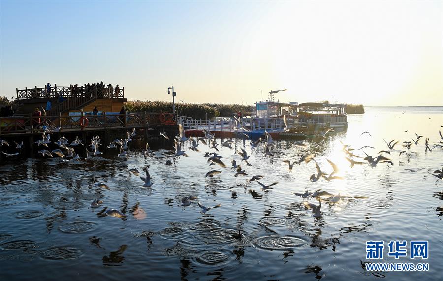居延海位于內(nèi)蒙古阿拉善盟額濟(jì)納旗北部,是我國第二大內(nèi)陸河黑河的尾閭湖。其形狀狹長彎曲,猶如新月,額濟(jì)納河匯入湖中。2003年以來,隨著黑河分水工程的實(shí)施,干涸已久的東居延海湖盆重現(xiàn)碧波蕩漾的美景,煥發(fā)出勃勃生機(jī)。 新華社記者 彭源 攝