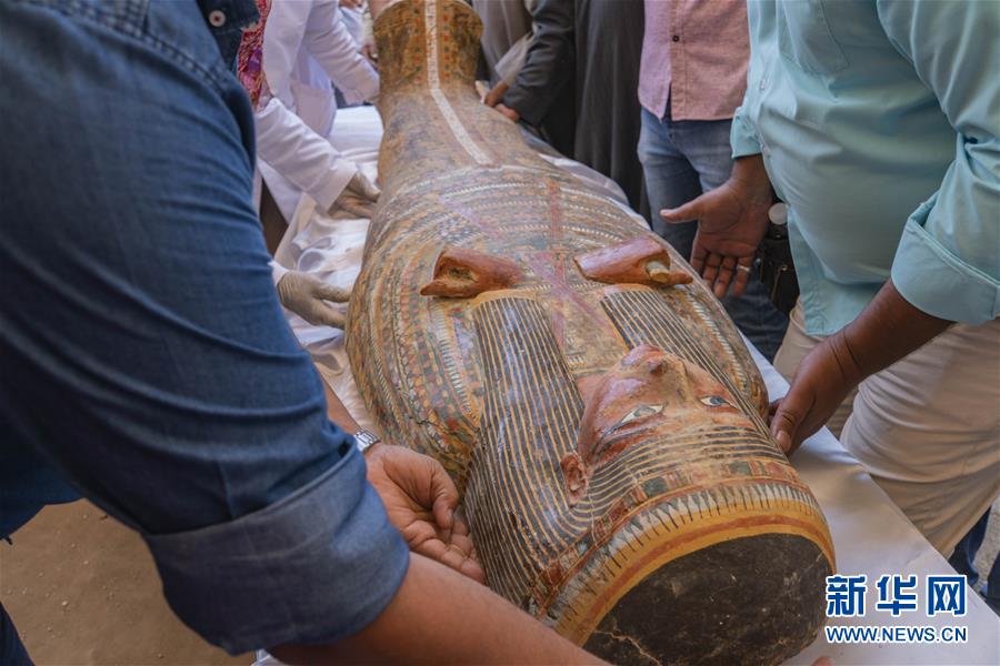 這是10月19日在埃及盧克索拍攝的近期發(fā)掘出的棺槨。 埃及文物部19日在南部城市盧克索舉行的新聞發(fā)布會(huì)上宣布,埃及考古隊(duì)近期發(fā)掘出30具3000年前的木質(zhì)棺槨。 新華社記者 李碧念 攝