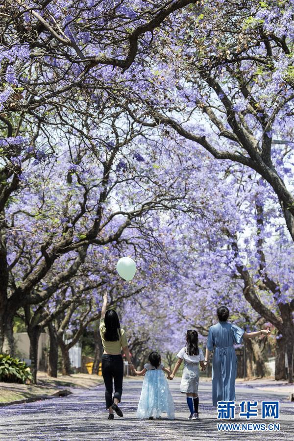 10月20日,在南非比勒陀利亞,游人在藍(lán)花楹樹(shù)下賞花。新華社記者陳誠(chéng)攝