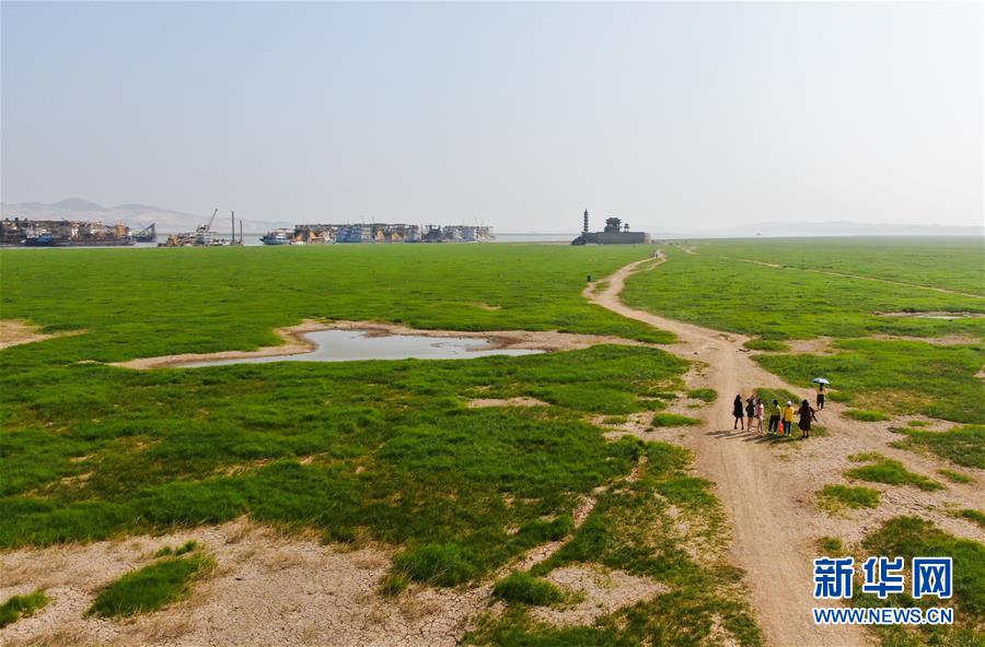 10月9日,江西省廬山市,游客行走在鄱陽(yáng)湖湖區(qū)干涸的湖面上(無人機(jī)拍攝)。新華社記者胡晨歡攝
