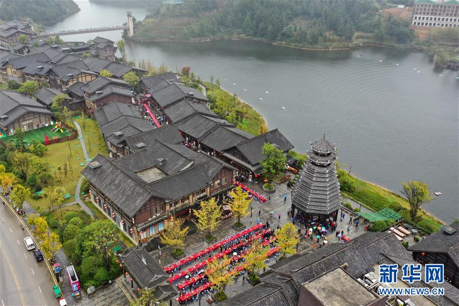丹寨縣萬達(dá)小鎮(zhèn)萬人長(zhǎng)桌宴(10月26日無人機(jī)拍攝)。