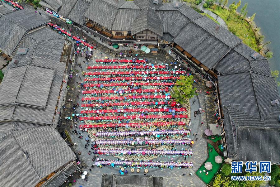 丹寨縣萬達小鎮(zhèn)“萬人長桌宴”(10月26日無人機拍攝)。新華社記者歐東衢攝
