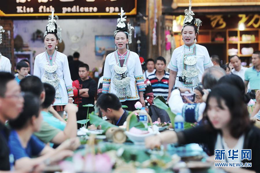 7月2日,侗族同胞在丹寨萬達小鎮(zhèn)內為游客演唱侗族大歌。新華社記者歐東衢攝