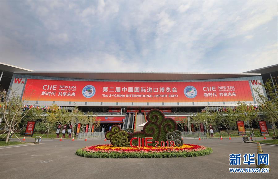 這是10月25日拍攝的國家會展中心(上海)西入口處。 第二屆中國國際進口博覽會開幕在即,在進博會舉辦地、國家會展中心(上海)內,展館搭建施工人員和展會志愿者們在進行從展臺搭建到完善觀展標識等的布展準備工作。 新華社記者 方喆攝