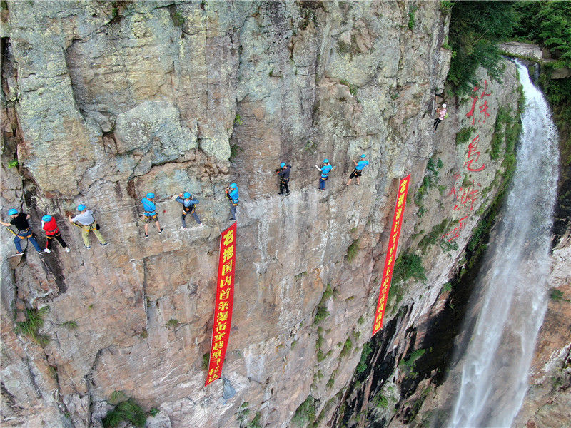 2019年6月28日,浙江寧波,游客在體驗(yàn)“懸崖鋼索棧道”項(xiàng)目。張培堅(jiān)/視覺(jué)中國(guó)