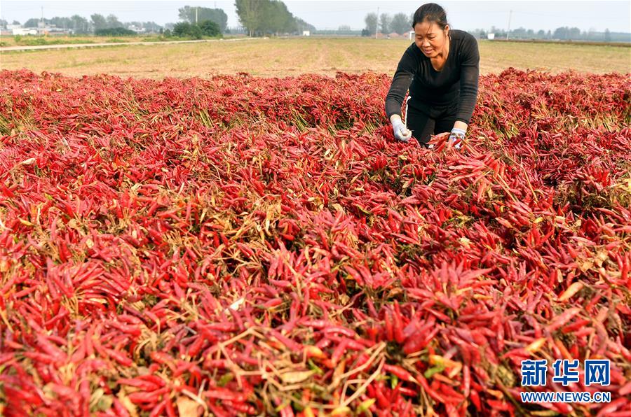 河南省寶豐縣鬧店鎮(zhèn)周營村的村民在晾曬辣椒(10月16日攝)。