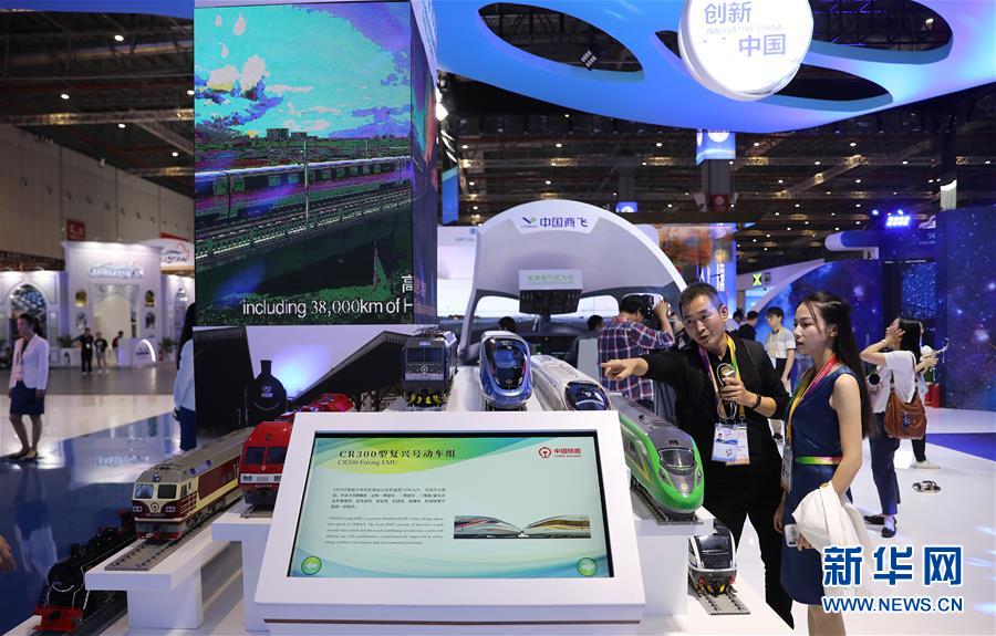 11月2日,在第二屆中國國際進(jìn)口博覽會國家展展區(qū)內(nèi)的中國館,工作人員在一組中國鐵路展品旁討論交流。 新華社記者 方喆攝