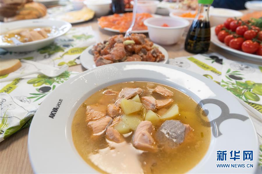 這是9月13日在俄羅斯摩爾曼斯克以北的巴倫支海域的鮭魚(yú)養(yǎng)殖場(chǎng)拍攝的鮭魚(yú)湯。 新華社記者白雪騏攝