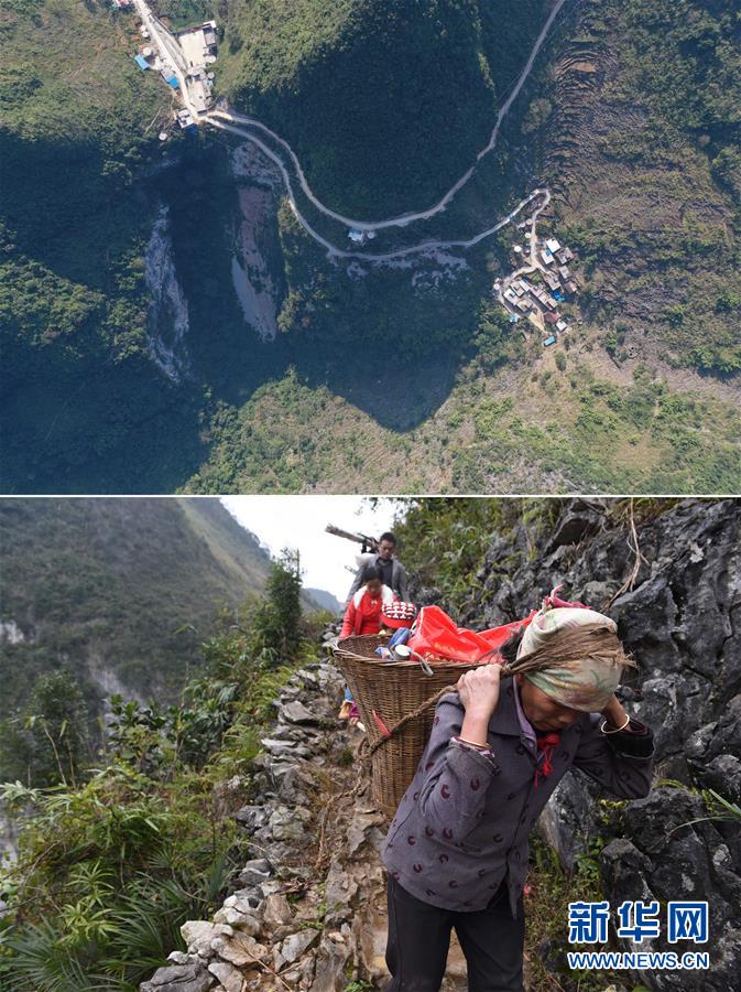 拼版照片:上圖為已經(jīng)修通水泥路的大化瑤族自治縣板升鄉(xiāng)八好村八好屯(11月11日無人機(jī)拍攝);下圖為在尚未通路的八好村八好屯,村民背著年貨走山路回家(2016年1月26日攝)。新華社記者 黃孝邦 攝