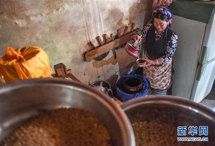 西藏昌都市芒康縣納西民族鄉(xiāng)村民在自家釀造葡萄酒(6月3日攝)。新華社記者晉美多吉攝