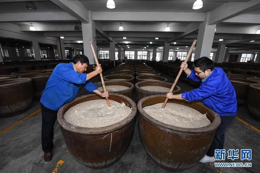 11月7日,古越龍山紹興酒股份有限公司釀酒一廠的工人進行“開耙”攪拌。新華社記者徐昱攝