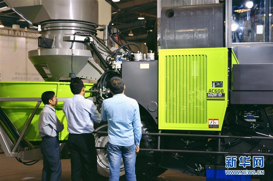 11月16日,參觀者在展會現(xiàn)場參觀甘蔗收割機械設(shè)備。