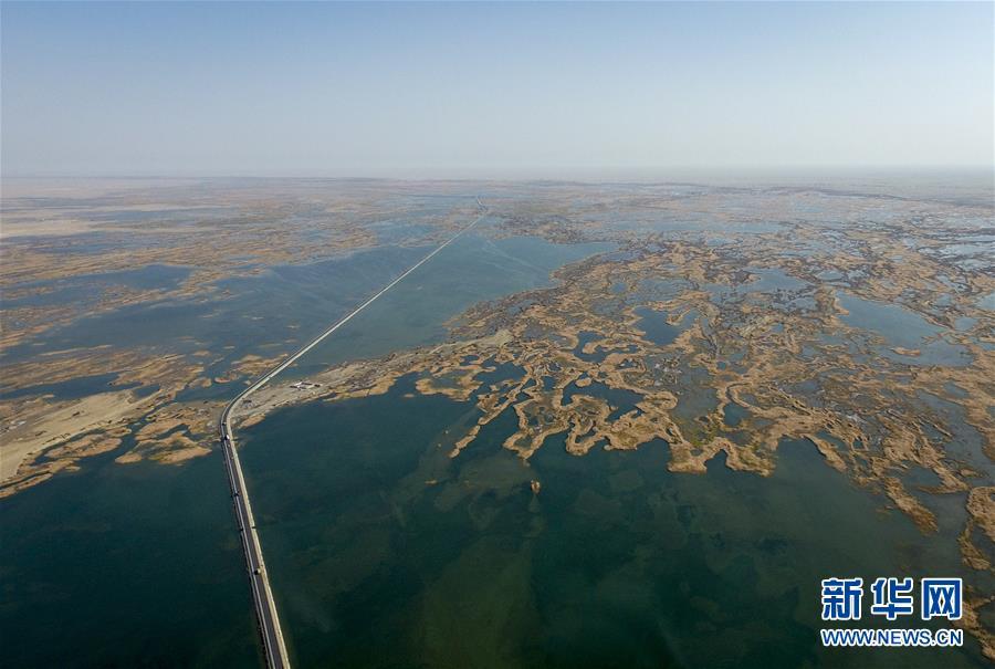 218國道在塔里木河尾閭——臺特瑪湖中間延伸(2017年10月22日無人機(jī)拍攝)。新華社記者趙戈攝