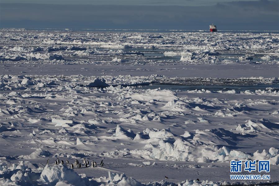 從“雪龍2”號(hào)上拍攝的企鵝群和“雪龍”號(hào)(11月19日攝)。新華社記者劉詩(shī)平攝