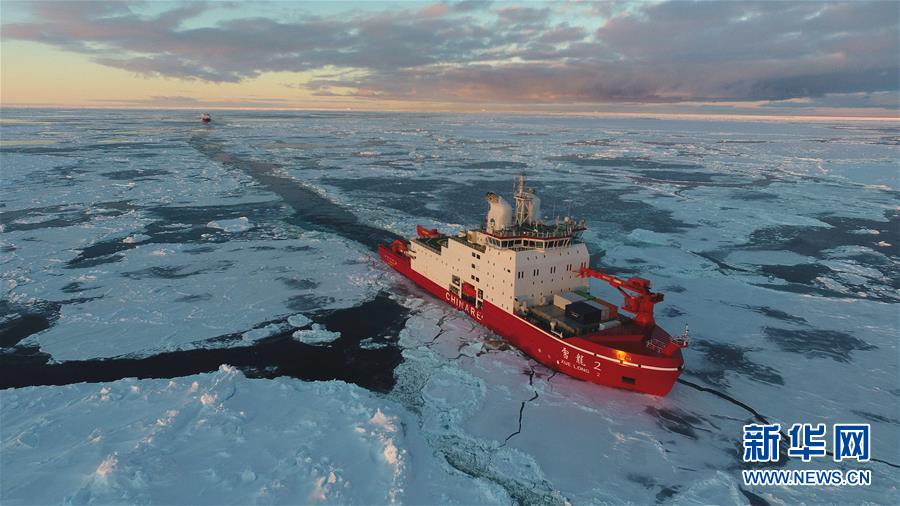 航行在南極圈內(nèi)浮冰區(qū)的“雪龍2”號和“雪龍”號(11月19日無人機拍攝)。新華社記者劉詩平攝