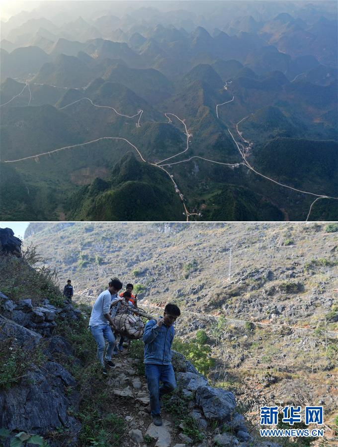 拼版照片:上圖為已經(jīng)修通水泥路的大化瑤族自治縣板升鄉(xiāng)八好村八好屯(11月11日無(wú)人機(jī)拍攝);下圖為在尚未通路的八好村八好屯,村民背著化肥走山路回家(2016年4月15日攝)。新華社記者黃孝邦攝