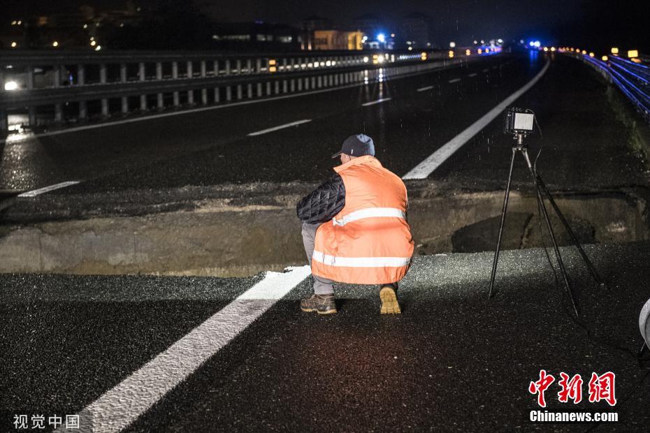 當(dāng)?shù)貢r(shí)間2019年11月24日,意大利Villafranca dAsti,意大利遭受惡劣天氣和持續(xù)多日的暴雨,通往都靈方向的A21高速公路路面出現(xiàn)“大坑”。圖片來源:視覺中國