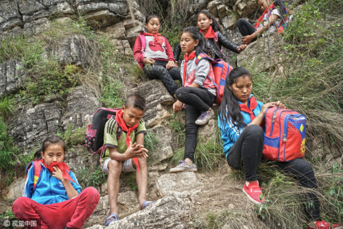 上學(xué)的孩子都背著沉沉的書包,大多數(shù)是女孩,15個(gè)孩子在三個(gè)家長的保護(hù)下,大約用了2個(gè)小時(shí),到達(dá)“懸崖村”。上山容易下山難,遇到雨雪天氣,村里人就不再外出了。圖片來源:視覺中國
