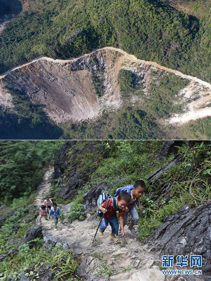 拼版照片:上圖為剛剛修通公路的大化瑤族自治縣板升鄉(xiāng)八好村弄麻屯(11月11日無人機(jī)拍攝);下圖為在尚未通路的八好村弄麻屯,孩子們爬山路回家(2016年9月23日攝)。新華社記者黃孝邦攝