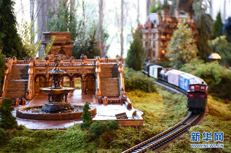 11月26日,在美國紐約植物園節(jié)日小火車展上,一輛模型小火車駛過紐約中央公園貝塞斯達噴泉和臺階微縮模型。新華社記者韓芳攝