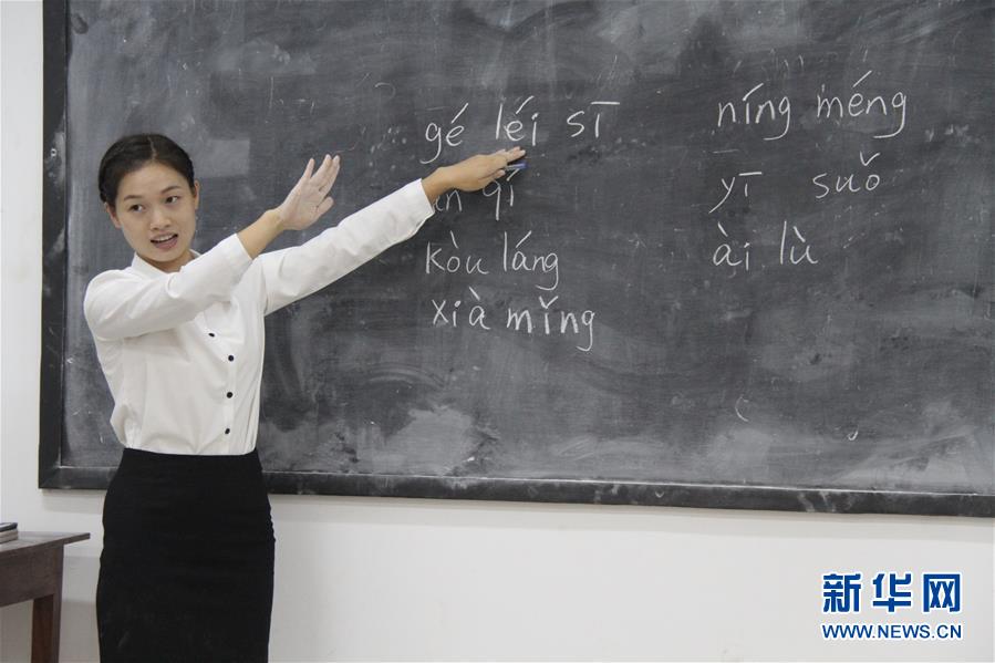 11月18日,在多哥首都洛美,中國(guó)老師文盼在第一堂中文課上講習(xí)拼音。新華社記者肖玖陽攝