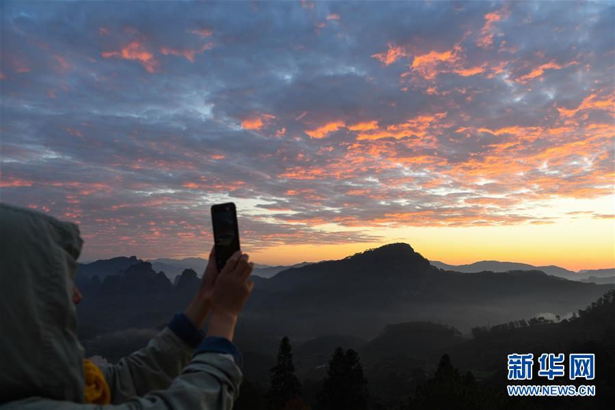 11月17日,在福建省武夷山風(fēng)景名勝區(qū)齊云峰附近,游客在拍攝朝霞。新華社記者宋為偉攝