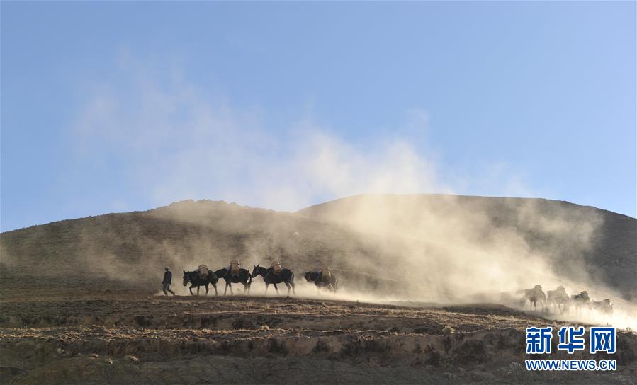 12月6日,向山頂塔基施工現(xiàn)場馱負(fù)工程物料的騾馬隊(duì)在夕陽下卸貨歸來。新華社記者侯捷攝