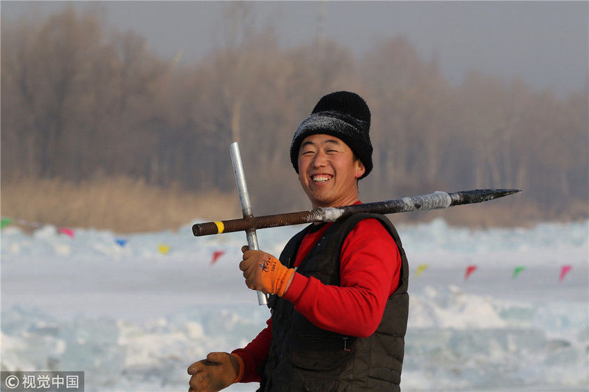 2018年12月11日,黑龍江省哈爾濱市,松花江上,采冰者們彎腰拉繩,宛如纖夫般拽重達半噸的冰塊出水。采冰者都是自哈市江北萬寶、東發(fā)、沙陀子等鄉(xiāng)鎮(zhèn)的農(nóng)民,他們每年冬閑時都會親屬、村鄰之間結(jié)伴到松花江畔采冰,有的采冰人,已經(jīng)連續(xù)干了二十多年。每個采冰季,他們每天要在冰面上工作10-12個小時,每個采冰組,一天要拽出冰塊2000-3000塊,一個近20天的采冰季,每人能收入近萬元。