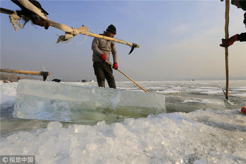2018年12月11日,黑龍江省哈爾濱市,松花江上,采冰者們彎腰拉繩,宛如纖夫般拽重達半噸的冰塊出水。采冰者都是自哈市江北萬寶、東發(fā)、沙陀子等鄉(xiāng)鎮(zhèn)的農(nóng)民,他們每年冬閑時都會親屬、村鄰之間結(jié)伴到松花江畔采冰,有的采冰人,已經(jīng)連續(xù)干了二十多年。每個采冰季,他們每天要在冰面上工作10-12個小時,每個采冰組,一天要拽出冰塊2000-3000塊,一個近20天的采冰季,每人能收入近萬元。