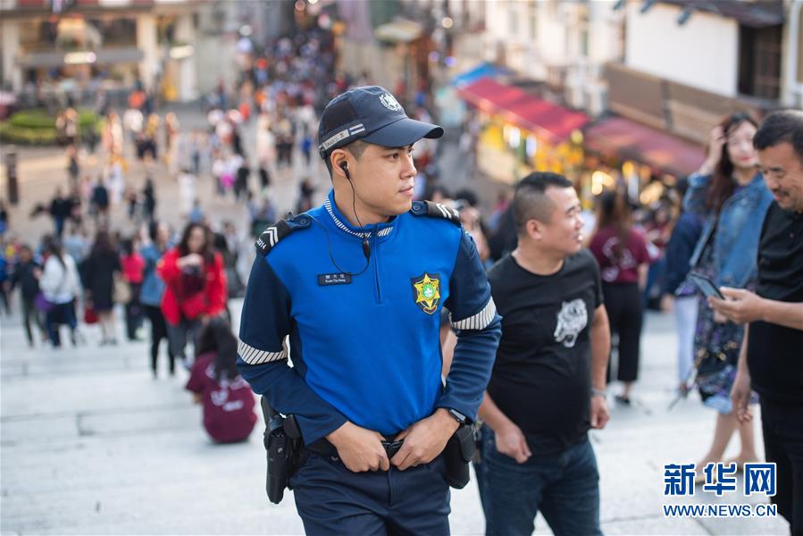 11月28日,澳門治安警察局旅游警察關天恒在大三巴牌坊附近巡邏,他已經工作了2年,主要負責維持社會治安及解答游客問題。 新華社記者 張金加 攝