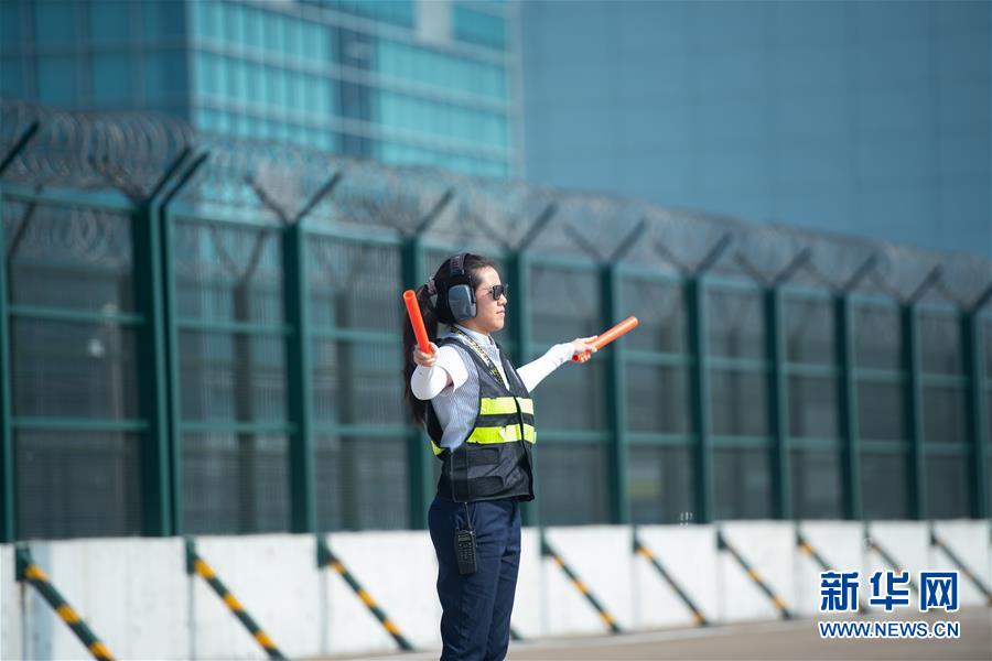11月25日,澳門(mén)國(guó)際機(jī)場(chǎng)營(yíng)運(yùn)員鄧祺君在機(jī)場(chǎng)指揮飛機(jī)停泊,她已經(jīng)工作了3年。 新華社記者 張金加 攝