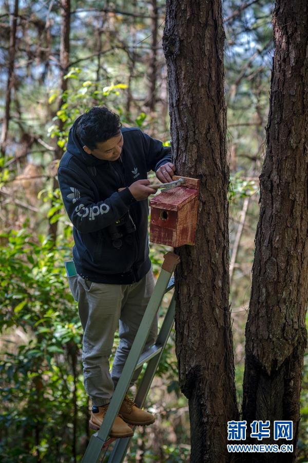 羅康在哀牢山的松樹林里安裝人工鳥巢(12月12日攝)。 新華社記者 胡超 攝