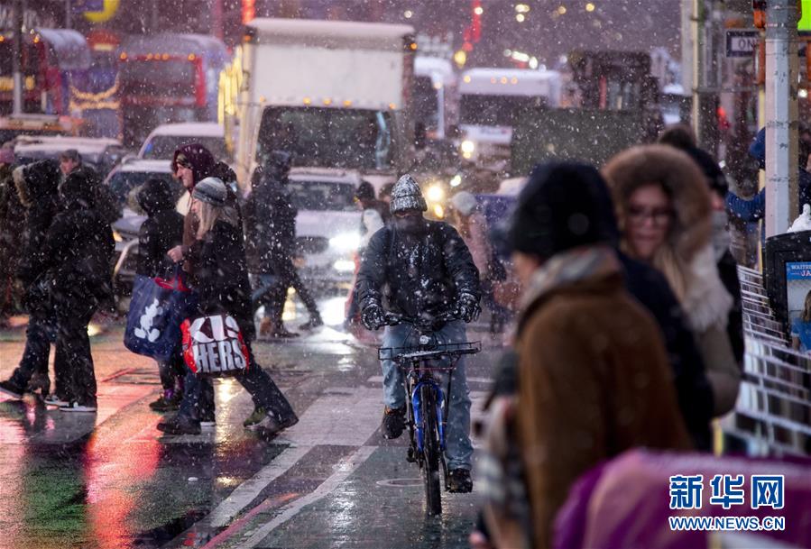 12月18日,在美國紐約時報廣場,一名男子冒雪騎行。