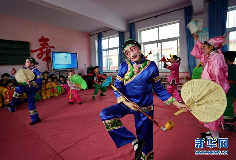 12月19日,河北省灤州市小閆營(yíng)小學(xué)學(xué)生在排練地秧歌。新華社記者 牟宇 攝