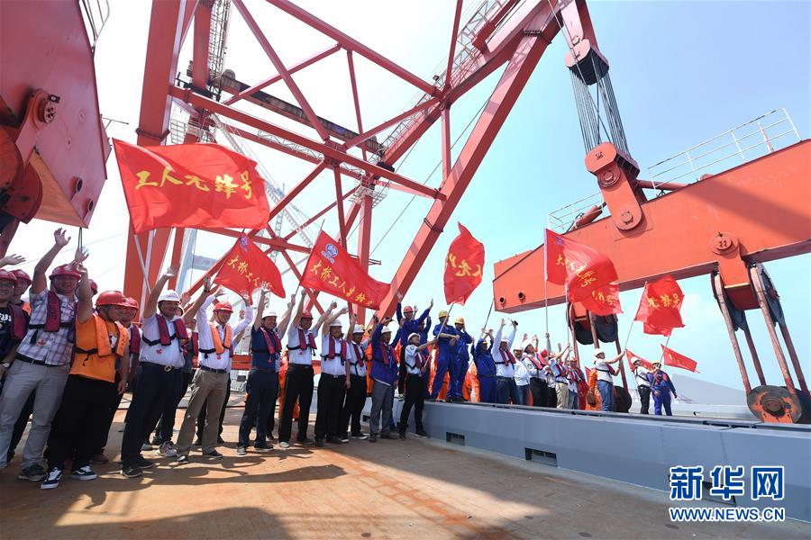 6月5日,福平鐵路平潭海峽公鐵兩用大橋的工作人員慶祝元洪航道橋主橋成功合龍。新華社記者林善傳攝