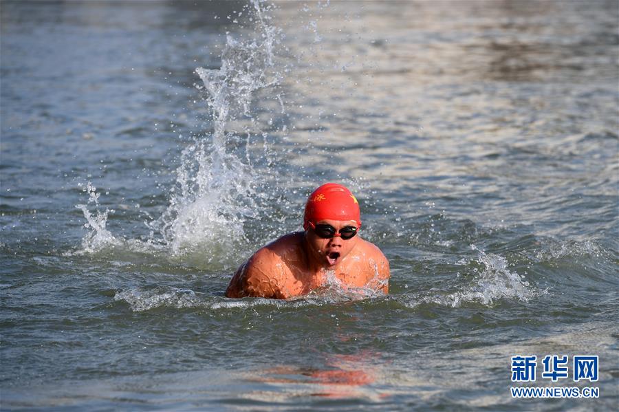 12月20日,83歲的冬泳愛好者周漢英在黃河冬泳。新華社記者陶希夷攝