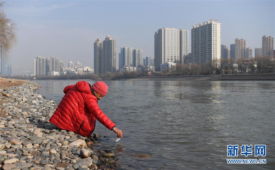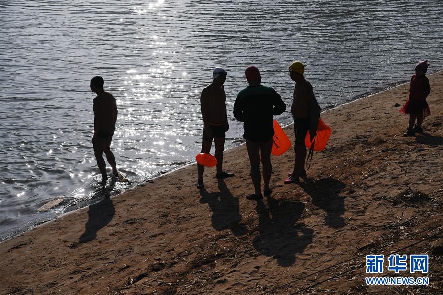 12月19日,在蘭州市馬拉松文化主題公園附近的黃河岸邊,冬泳愛好者入水準備冬泳。新華社記者馬寧攝