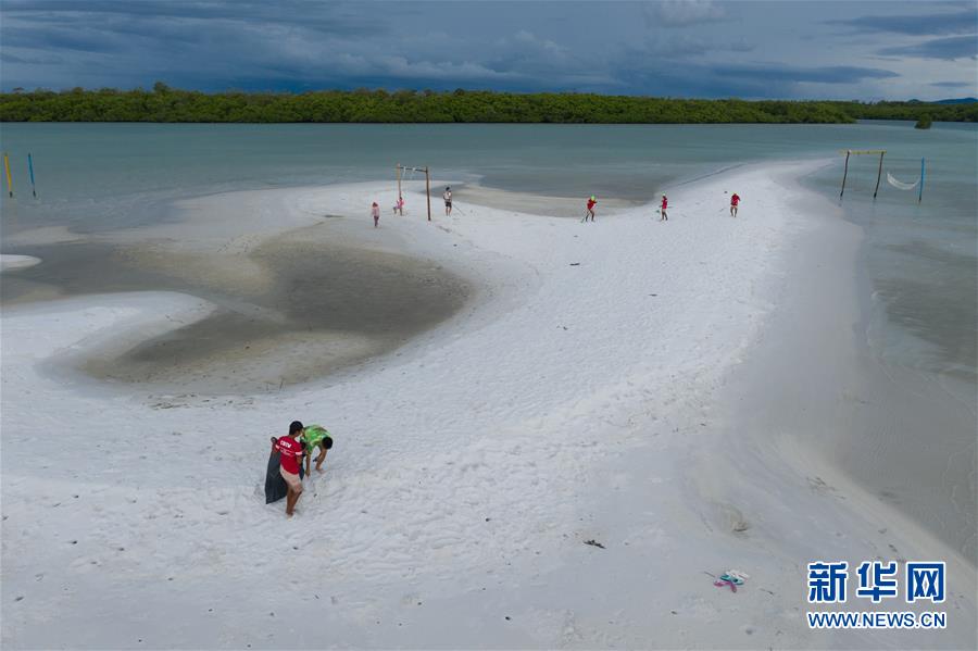 12月8日,在印度尼西亞邦加勿里洞省,李嘉文(左下)帶領工人在李王島的白色海床清理垃圾(無人機拍攝)。 新華社記者杜宇攝
