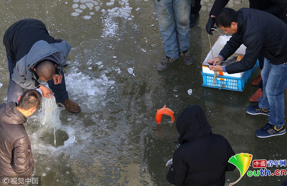 民眾鑿冰下網捕魚。