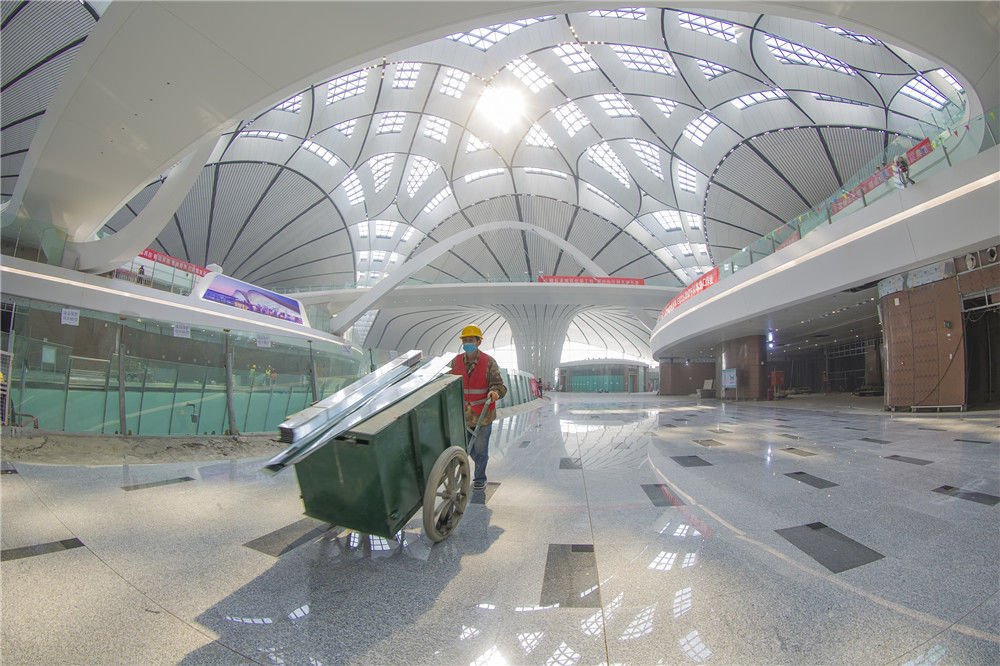 2019年4月26日,北京大興國際機場將于9月底正式通航。工程建設(shè)進入總攻階段,目前,航站樓內(nèi)部裝飾進行收尾的工作。武輝/千龍圖像/視覺中國